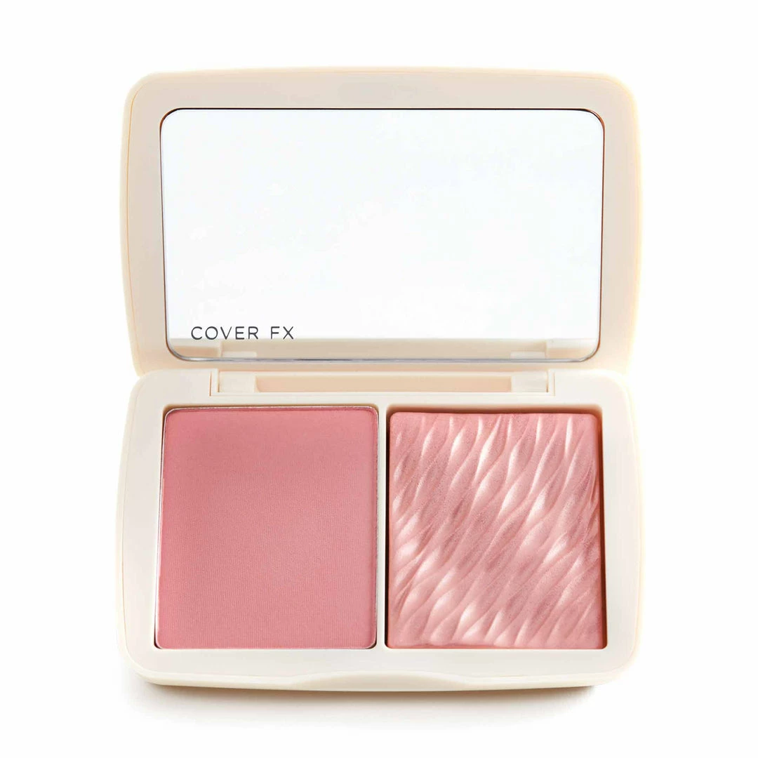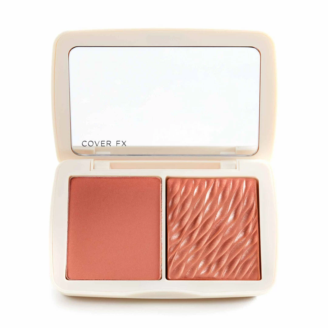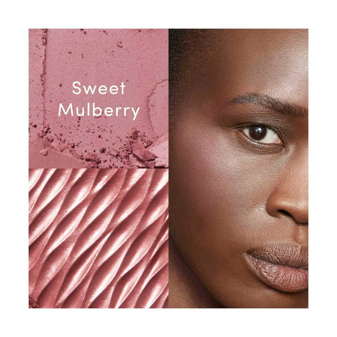 Pro-Tip: Use fingers to lightly tap shimmer shade over the matte across the apples of the cheeks for a sheer flushed glow.