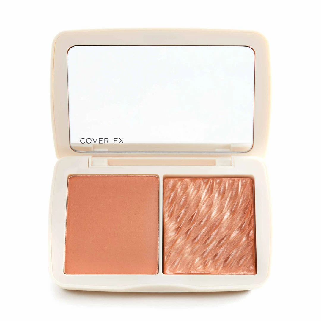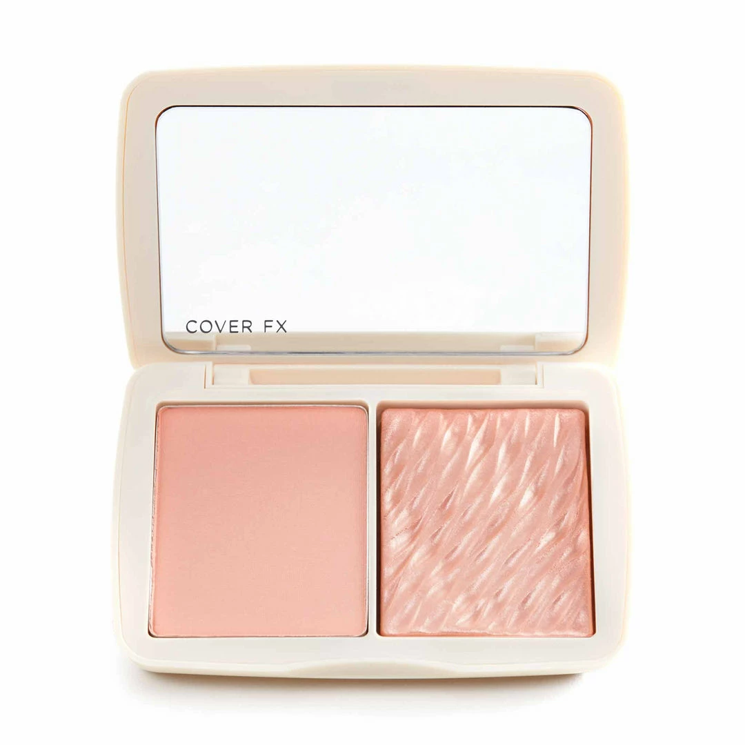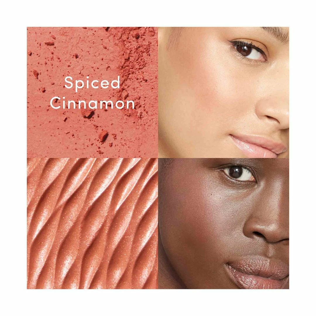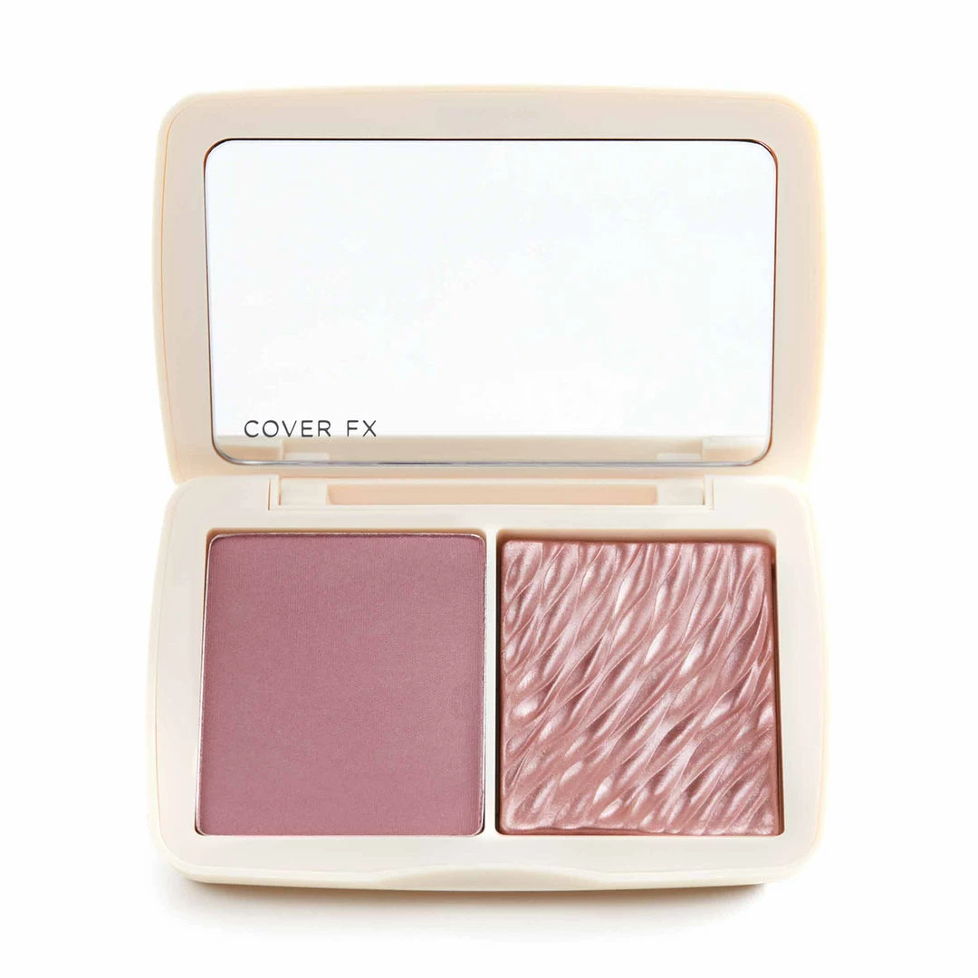 Pro-Tip: Use fingers to lightly tap shimmer shade over the matte across the apples of the cheeks for a sheer flushed glow.