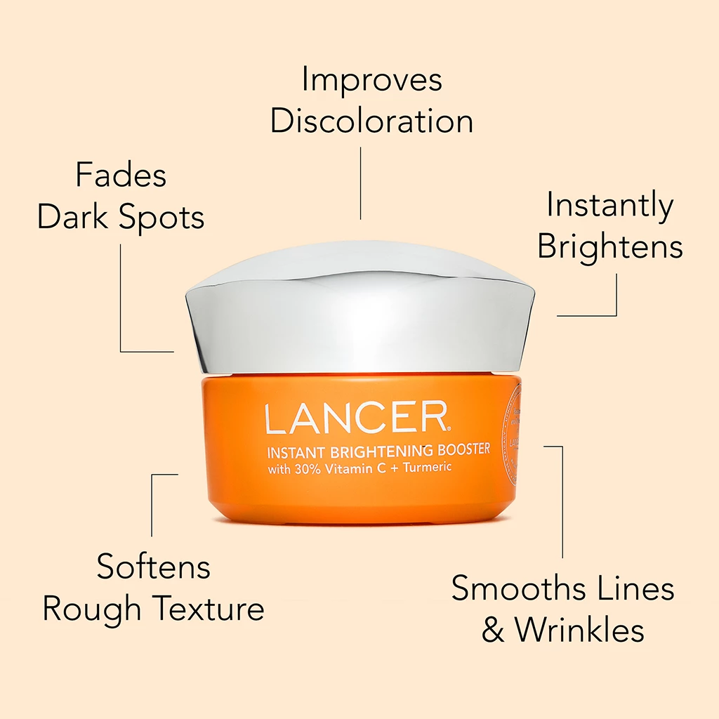 This revolutionary silky-smooth Instant Brightening Booster combines powerhouses 30% Vitamin C + Turmeric to provide dramatically visible brightening benefits for a more even and uniform skin tone. Super-charged with 30% stabilized Vitamin C (ascorbic acid), this weekly booster helps exfoliate surface hyperpigmentation and discoloration, prevents new darks spots from forming, brightens and evens skin tone, and minimizes fine lines and wrinkles. Turmeric?s powerful antioxidant and preventative capabilities defend skin against environmental triggers that can initiate new pigment formation. In addition, skin softening botanicals help hydrate and support the skin?s barrier.