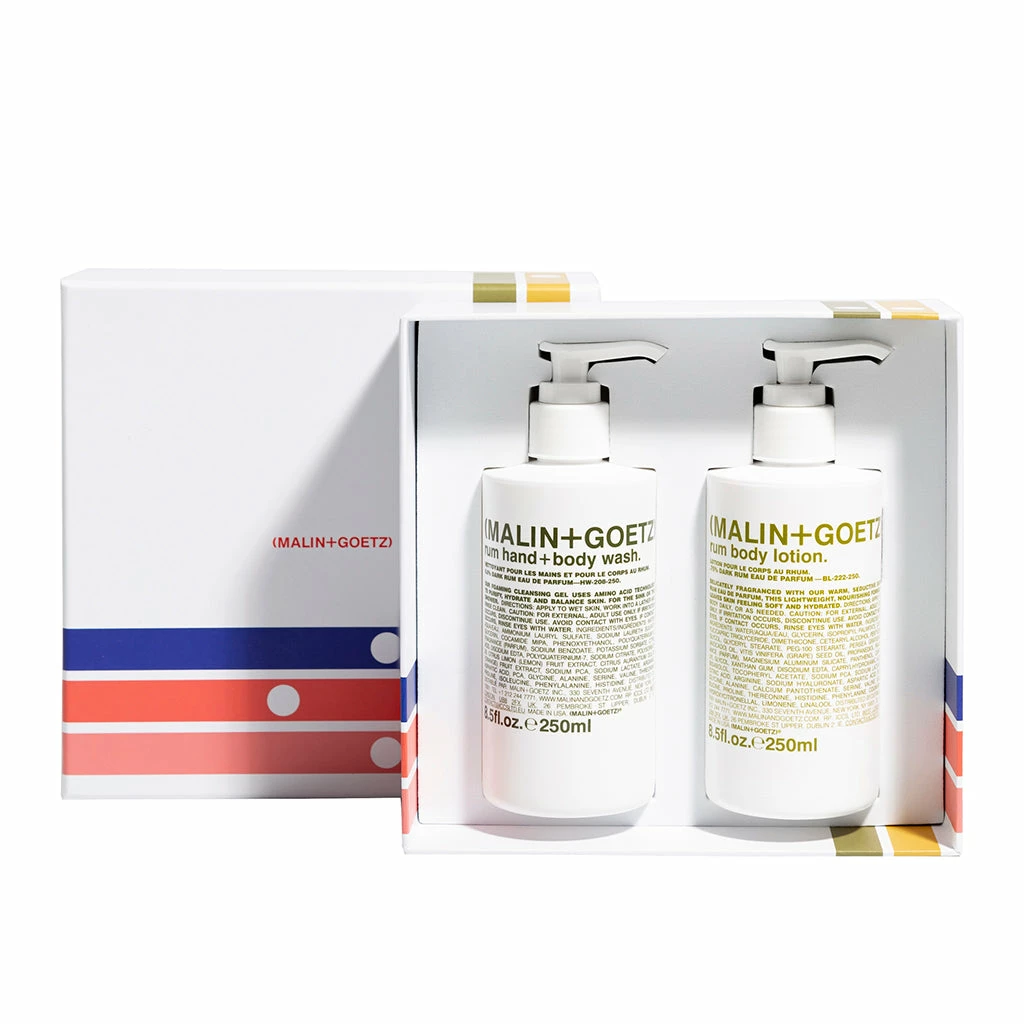 Get double rum this holiday with the Malin+Goetz Rum Body Lotion and Hand and Body Wash Gift Set. The hard-working cleansing gel lathers into a rich foam under running water to thoroughly purify skin on the hands and body. Synthesized with our signature dark rum scent, amino acid-based cleansing agents and hydrating glycerin, this gentle yet effective formula rinses residue-free and without drying or stripping. Suitable for all skin types, especially sensitive. Natural color.