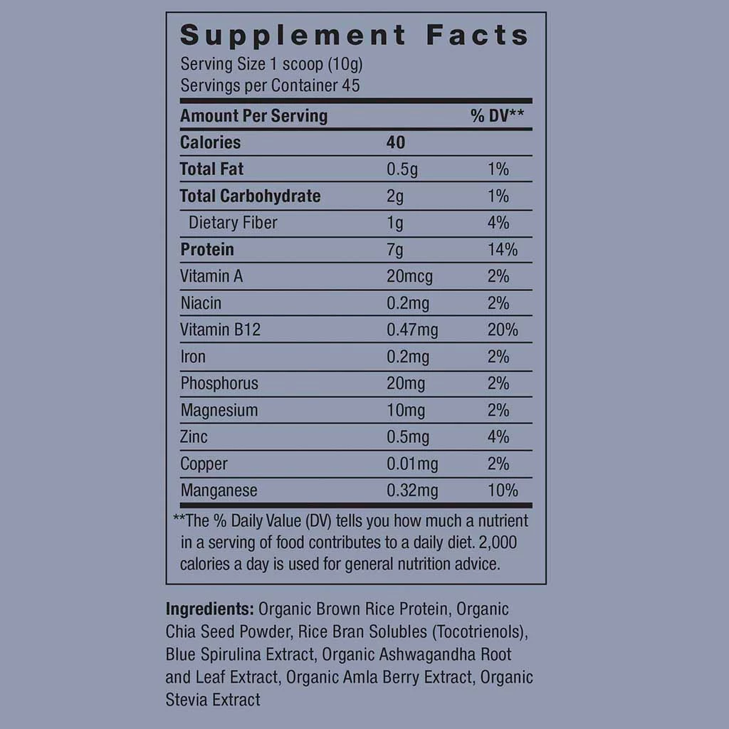 Organic Brown Rice Protein, Organic Chia Seed Powder, Rice Bran Solubles (Tocotrienols), Blue Spirulina Extract, Organic Ashwagandha Root and Leaf Extract, Organic Amla Berry Extract, Organic Stevia Extract