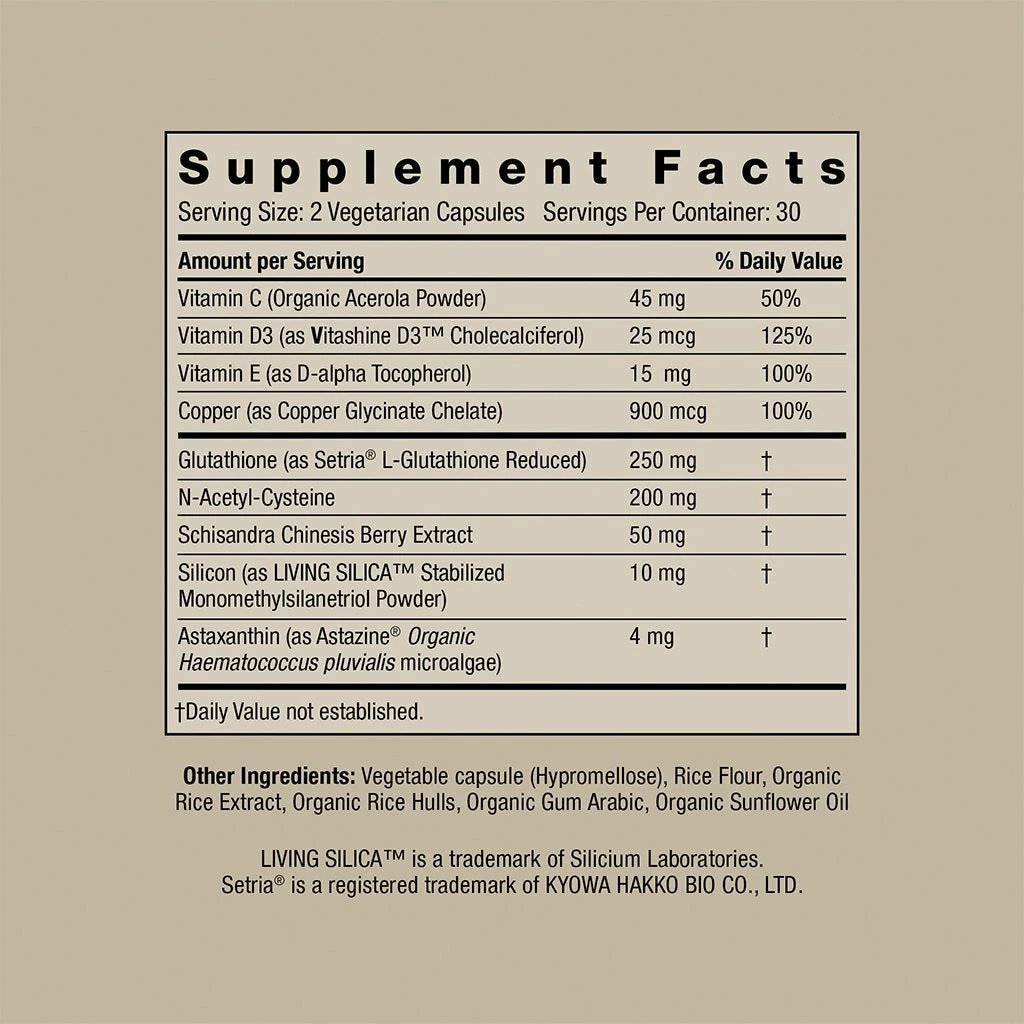 Vitamin C (as Organic Acerola Powder), Vitamin D3 (as Vitashine D3 Cholecalciferol), Vitamin E (as D-alpha Tocopherol), Copper (as Copper Glycinate Chelate), Glutathione (as Setria L-Glutathione Reduced), N-Acetyl-Cysteine, Schisandra Chinesis Berry Extract, Silicon (as LIVING SILICA Stabilized Monomethylsilanetriol Powder), Astaxanthin (as Astazine Organic Haematococcus pluvialis microalgae), Vegetable capsule (Hypromellose), Rice Flour, Organic Rice Extract, Organic Rice Hulls, Organic Gum Arabic, Organic Sunflower Oil.