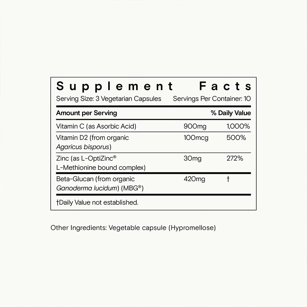 Vitamin C (as Ascorbic Acid), Vitamin D2 (from organic Agaricus bisporus), Zinc (as L-OptiZinc?? L-Methionine bound complex), Beta-Glucan (from organic Ganoderma lucidum) (MBG??), Vegetable capsule (Hypromellose).