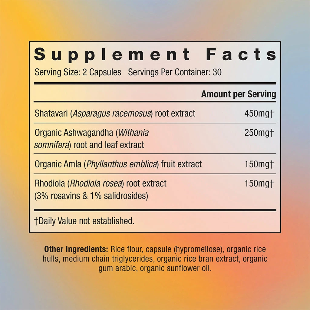 Shatavari root extract, organic Ashwagandha root and leaf extract, organic Amla fruit extract, Rhodiola root extract, Rice flour, capsule (hypromellose), organic rice hulls, medium chain triglycerides, organic rice bran extract, organic gum arabic, and organic sunflower oil.