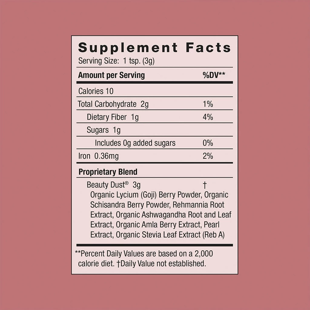 Beauty Dust is a beautifying adaptogenic blend of Schisandra, Amla, Ashwagandha, Rehmannia, Goji & Pearl that targets stress and accelerate aging, improves skin clarity, and helps protect from free radicals.*