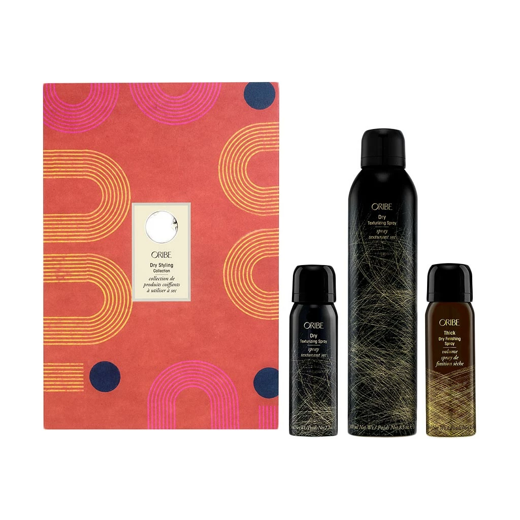 Shake Thick Dry Finishing Spray. Then spray and plump. Finishes and holds styles. Add heat for extra volume.Set incudes: