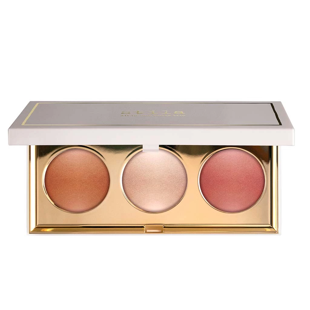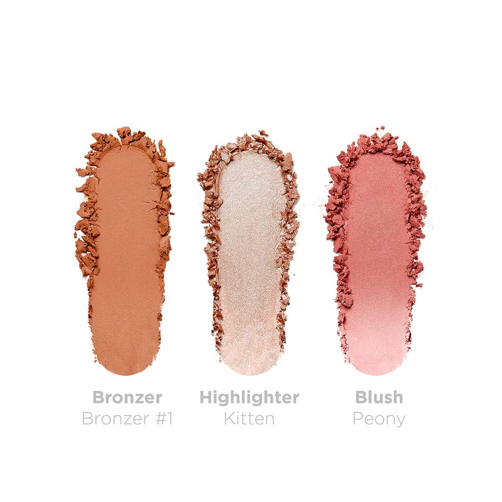 All you need to glow in one palette! These luxurious, bouncy-to-the-touch bronzer, highlighter and blush formulas blend effortlessly to instantly add a sun-kissed warmth and a skin-brightening flush for a radiant look. Versatile, the three formulas can be used separately as bronzer, highlighter, blush or they can be layered for added color, highlight and contour. Helps keep unwanted shine under control!