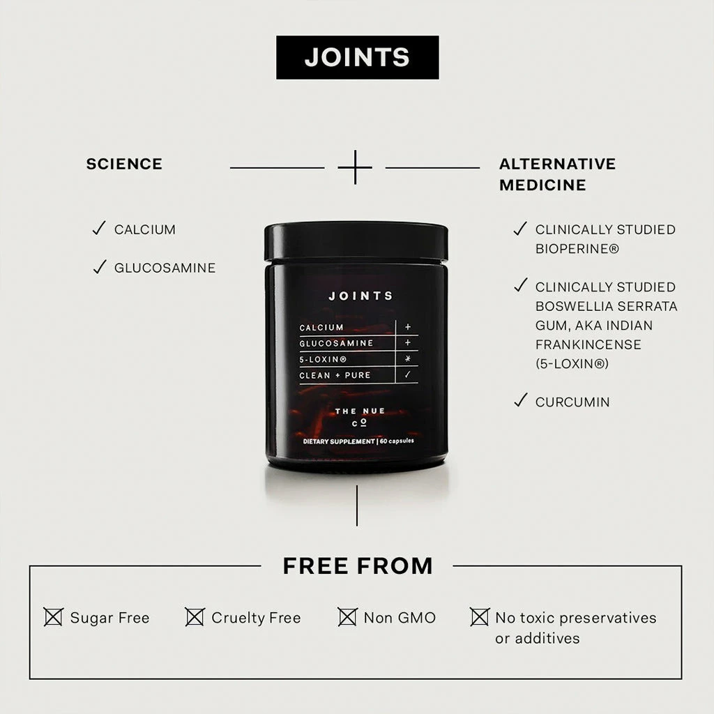 Generally we don’t pay attention to our joints until they begin to bother us. The Nue Co. Joints formula is designed for use from the first sign of a creaking knee, to the management of longer term conditions like osteoarthritis. The formula combines best practices from traditional Ayurvedic medicine with established minerals and clinically studied extracts. Everything your joints need, now and in the future.